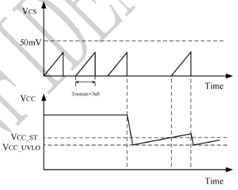 當(dāng)VCC電壓超過設(shè)定的過壓閾值(通常為55V至59.5V)時,LP8776AH會觸發(fā)過壓保護機制。此時,芯片將停止輸出PWM信號,防止因過高的電壓對芯片內(nèi)部電路和外部設(shè)備造成損害。過壓保護功能為芯片提供了一個安全的工作電壓范圍,確保其在電源電壓異常升高時能夠及時采取保護措施。