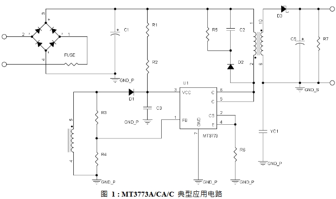 MT3773系列芯片采用脈沖頻率調(diào)制(PFM)技術(shù),建立非連續(xù)導電模式(DCM)的反激式電源,內(nèi)置準諧振(QR)模式,能夠?qū)崿F(xiàn)高效率的電能轉(zhuǎn)換。其典型應用電路如下: