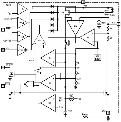 由于采用了內(nèi)部PMOSFET架構(gòu),加上防倒充電路,所以不需要外部隔離二極管。熱反饋可對(duì)充電電流進(jìn)行自動(dòng)調(diào)節(jié),以便在大功率操作或高環(huán)境溫度條件下對(duì)芯片溫度加以限制。充電電壓固定于 4.2V,而充電電流可通過(guò)一個(gè)電阻器進(jìn)行外部設(shè)置。當(dāng)充電電流在達(dá)到最終浮充電壓之后降至設(shè)定值 1/10 時(shí),TC4056A 將自動(dòng)終止充循環(huán)。內(nèi)部框架圖如下所示