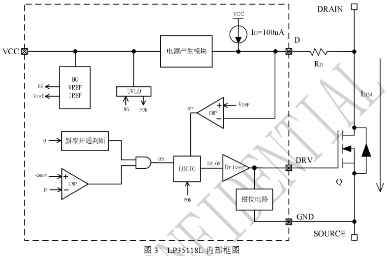 在LP35118L的設(shè)計中,還可以通過在D腳與MOS管的DRAIN腳之間串聯(lián)電阻RD來調(diào)節(jié)同步MOS關(guān)斷閾值。芯片內(nèi)部固定有ID=100uA的電流源,在RD上形成壓降,從而實現(xiàn)對同步MOS關(guān)斷閾值的調(diào)節(jié)。這種設(shè)計為工程師提供了更大的靈活性,可以根據(jù)不同應(yīng)用場景的需求,精準(zhǔn)地調(diào)整同步整流管的關(guān)斷特性,進(jìn)一步優(yōu)化系統(tǒng)性能。