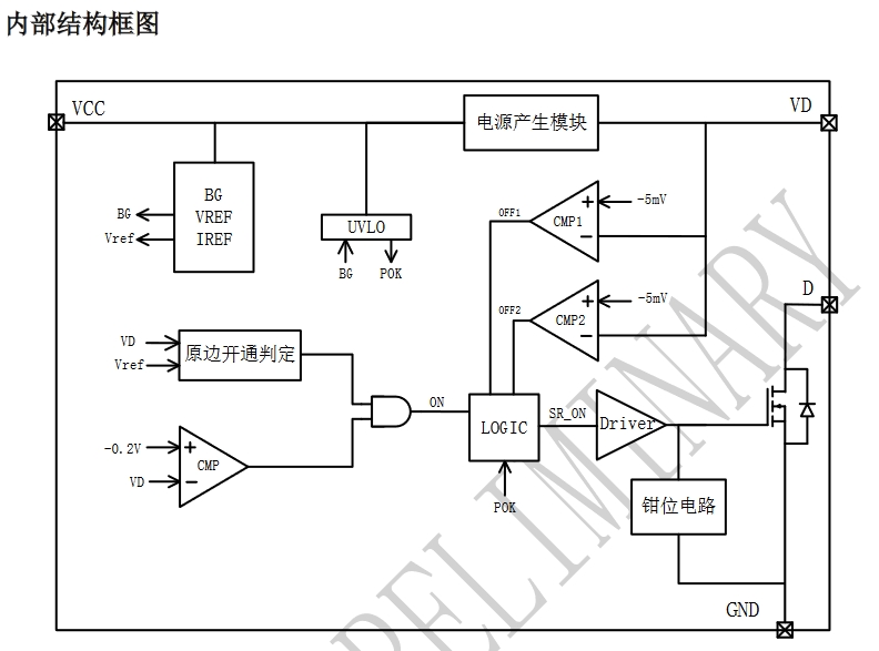 輸出下端:VCC欠壓保護(hù)和過(guò)壓鉗位功能通過(guò)VD腳的分壓實(shí)現(xiàn),保護(hù)同樣有效。