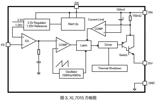 XL7015是一款高效、高壓降壓型DC-DC轉(zhuǎn)換器,固定150KHz開(kāi)關(guān)頻率,可提供最高0.8A輸出電流能力,低紋波,出色的線性調(diào)整率與負(fù)載調(diào)整率。XL7015內(nèi)置固定頻率振蕩器與頻率補(bǔ)償電路,簡(jiǎn)化了電路設(shè)計(jì)。PWM 控制環(huán)路可以調(diào)節(jié)占空比從0~90%之間線性變化。內(nèi)置輸出過(guò)電流保護(hù)功能,當(dāng)輸出短路時(shí),開(kāi)關(guān)頻率從150KHz降至45KHz。內(nèi)部補(bǔ)償模塊可以減少外圍元器件數(shù)量。內(nèi)部框架圖如下~