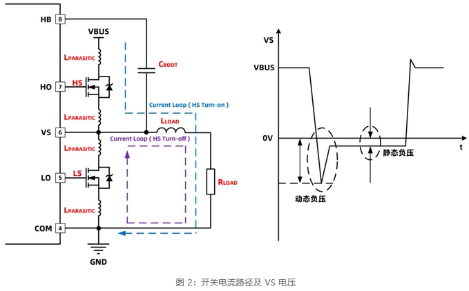 當(dāng)控制信號(hào)HIN為高電平,LIN為低電平時(shí),高側(cè)功率器件導(dǎo)通,低側(cè)功率器件關(guān)閉,電流從輸入端流向負(fù)載。