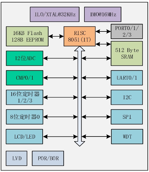 采用1T 8051內(nèi)核,時鐘頻率最高可達(dá)33MHz,同時具備低功耗模式,動態(tài)功耗低至0.18mA/MHz。