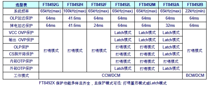 在保護(hù)功能方面,F(xiàn)T8492系列芯片提供了多種保護(hù)機(jī)制,且保護(hù)模式可選。例如,其過載保護(hù)(OLP)和輸出過壓保護(hù)(OVP)可選擇打嗝模式或Latch模式,以適應(yīng)不同的應(yīng)用場景和設(shè)計(jì)需求。打嗝模式在故障發(fā)生時(shí)會(huì)自動(dòng)重啟芯片,而Latch模式則會(huì)鎖定故障狀態(tài),直到故障排除后重新啟動(dòng)。這種靈活的保護(hù)模式選擇,為設(shè)計(jì)人員提供了更大的靈活性,能夠根據(jù)具體應(yīng)用需求優(yōu)化保護(hù)策略。