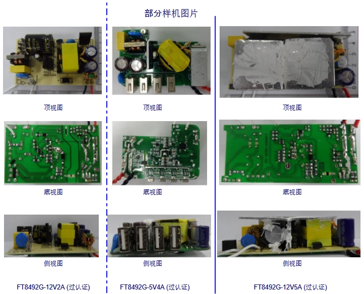 FT8492G作為該系列的典型型號(hào),已經(jīng)成功應(yīng)用于多種適配器設(shè)計(jì)中。例如,F(xiàn)T8492G-12V2A、FT8492G-5V4A和FT8492G-12V5A等樣機(jī)均已通過相關(guān)認(rèn)證。這些樣機(jī)的性能表現(xiàn)優(yōu)異,不僅在效率上達(dá)到了DoE/CoC六級(jí)標(biāo)準(zhǔn),還在實(shí)際使用中表現(xiàn)出良好的穩(wěn)定性和可靠性。