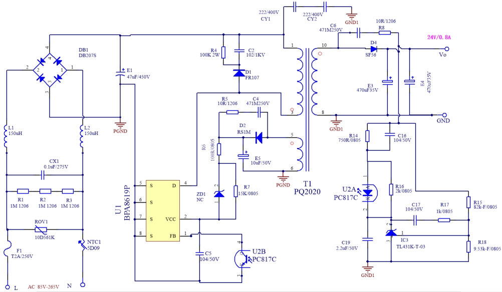 BPA8619P 的電路圖是整個電源方案的核心,它詳細展示了電源電路的各個組成部分以及它們之間的連接關系。從電路圖中可以看出,該電源采用了典型的反激式開關電源拓撲結構,這種結構具有電路簡單、成本較低、易于實現(xiàn)等優(yōu)點,同時也能滿足較高的性能要求。