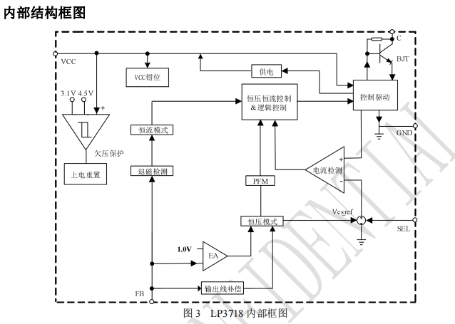 在恒壓控制方面,LP3718BSL通過電阻采樣反激電壓,電阻分壓后得到的電壓與內(nèi)部基準(zhǔn)比較形成閉環(huán)后,來恒定輸出電壓Vout。這種恒壓控制方式使得輸出電壓能夠精確地保持在設(shè)定值,確保了設(shè)備的穩(wěn)定運(yùn)行。