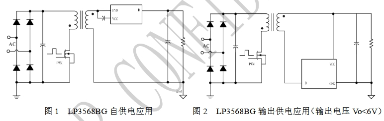 在自供電應(yīng)用中,LP3568BG通過(guò)其D腳連接輸出電壓,利用內(nèi)置MOS的體二極管對(duì)輸出電容充電,實(shí)現(xiàn)自供電啟動(dòng)。當(dāng)VCC電壓達(dá)到開(kāi)啟閾值時(shí),芯片內(nèi)部控制電路開(kāi)始工作,MOS管正常導(dǎo)通和關(guān)斷,電流從MOS管的溝道流過(guò),而非體二極管,從而實(shí)現(xiàn)高效的同步整流。這種應(yīng)用方式適用于需要簡(jiǎn)化電路設(shè)計(jì)、減少外部電源依賴的場(chǎng)景。