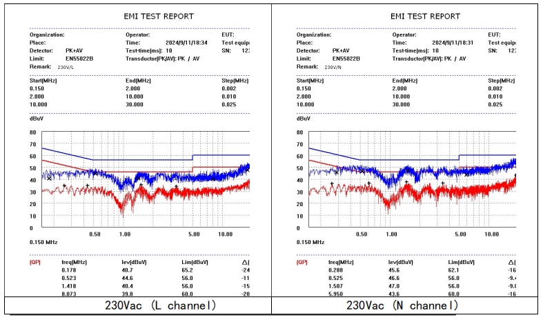 在 115Vac 和 230Vac 條件下,對(duì)電源的傳導(dǎo) EMI 進(jìn)行測(cè)試。測(cè)試結(jié)果顯示,電源的傳導(dǎo) EMI 滿足 EN55022B 標(biāo)準(zhǔn)。