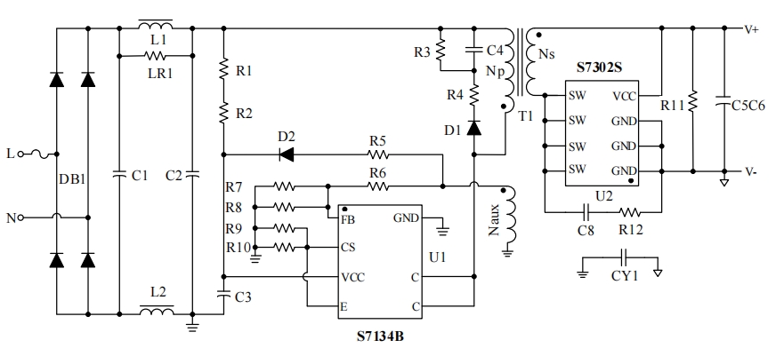 S7134B芯片的電路原理圖是其參考設計的核心部分,它詳細展示了芯片如何與其他電子元件協(xié)同工作,以實現(xiàn)恒壓恒流的電源輸出。以下是電路原理圖的簡要說明:
