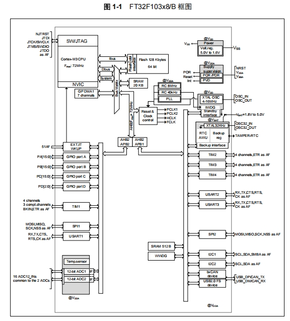 FT32F103系列的結(jié)構(gòu)框圖如上圖所示,展示了內(nèi)部主要模塊及其連接方式。引腳定義詳細列出了每個引腳的功能,包括電源引腳、I/O引腳、復位引腳等。
