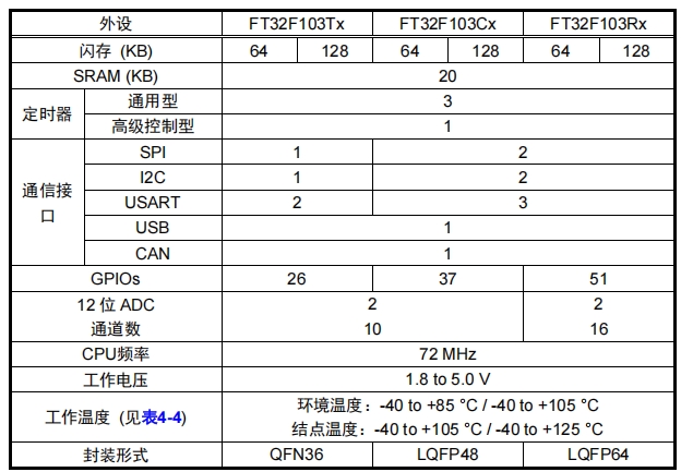 FT32F103x8/B 微控制器集成了高性能的 Arm? Cortex?-M3 32 位 RISC 內(nèi)核,工作頻率為 72 MHz,內(nèi)嵌高速存儲器 (高達 128 KB 的閃存和 20 KB 的 SRAM),以及大量的增強型 I/O 和連接到兩條 APB總線的外設。所有器件都提供兩個 12 位 ADC、三個通用 16 位定時器和一個 PWM 定時器,以及標準和先進的通信接口:多達兩個 I2C、兩個 SPI、 三個 USART、一個 USB 和一個 CAN。