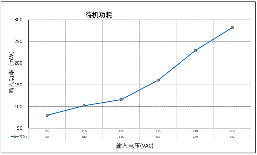 在 230VAC 輸入下,包含 1kΩ 假負載的待機功耗為 229mW,滿足大多數(shù)應用場景的低功耗要求。