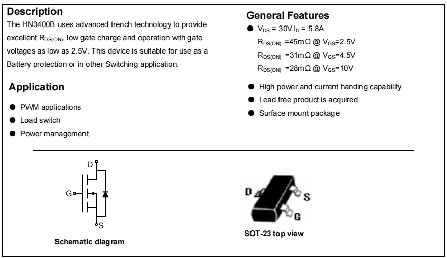 HN3400:低壓驅(qū)動(dòng)最友好(2.5 V 即可 35 mΩ),適合單節(jié)鋰電池保護(hù)。