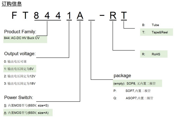 FT8441A:適用于 Buck 結(jié)構(gòu),持續(xù)輸出電流為 300mA,封裝形式同樣為 SOP8。