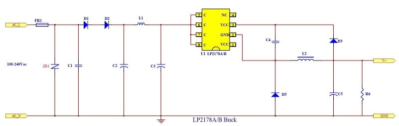 變壓器通過電磁感應將輸入的高電壓轉換為適合降壓轉換器處理的低電壓。在本方案中,變壓器將整流后的直流電壓轉換為適合LP2178B芯片處理的電壓水平,從而實現(xiàn)高效的降壓轉換。