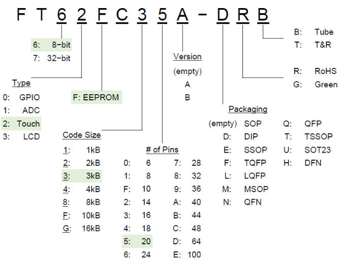 | FT62FC35A | 20 | 3 K×14 | 256 B | 128 B | 8 | 8 | 4 | √ | SOP20/TSSOP20/DIP20/QFN20 | 旗艦全功能 |