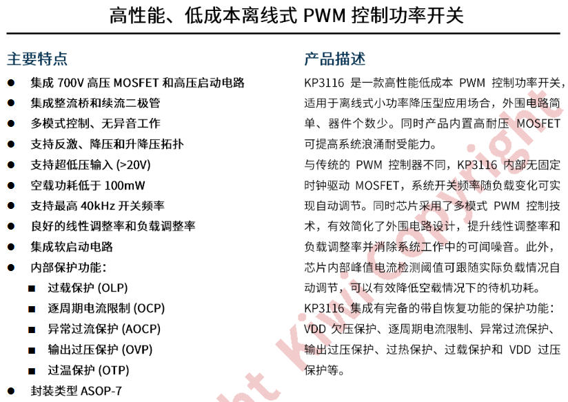 KP3116WPA 把“高壓 MOS + 高壓啟動 + 多模式 PWM”一口氣塞進 SOP-7,外圍僅 8 顆料,空載 <100 mW,系統(tǒng)成本 <0.45 元,PCB 1 cm2 搞定??赐赀@篇,你會明白什么叫“一粒米”電源。