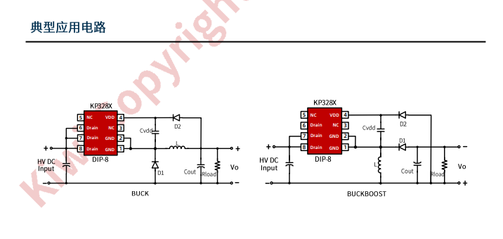 KP328X 集成有完備的帶自恢復(fù)功能的保護(hù)功能: VDD 欠壓保護(hù)、逐周期電流限制、過熱保護(hù)、過載保護(hù)和 VDD 過壓保護(hù)等。