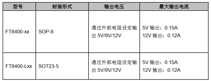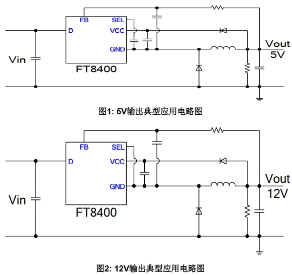 FT840X具有三種固定輸出電壓5V、9V和12V,可以通過SEL 腳進行設(shè)定。當(dāng)SEL懸空時,輸出為5V;當(dāng)SEL接160Kohm電阻到地時,輸出為9V;當(dāng)SEL短路到地時,輸出為12V。