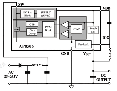 AP8506基于高壓同步整流架構(gòu),集成PFM控制器以及650V高可靠性MOSFET,用于外圍元器件極精簡的小功率非隔離開關(guān)電源。AP8506內(nèi)置730V高壓啟動(dòng),實(shí)現(xiàn)系統(tǒng)快速啟動(dòng)、超低待機(jī)功能。該芯片提供了完整的智能化保護(hù)功能,包括過流保護(hù),欠壓保護(hù),過溫保護(hù)。另外AP8506具有優(yōu)異的EMI特性。