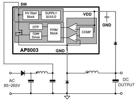 AP8003ZAC-T1集成PFM控制器及500V高可靠性MOSFET,用于外圍元器件極精簡的小功率非隔離開關(guān)電源。AP8003內(nèi)置500V高壓啟動(dòng),實(shí)現(xiàn)系統(tǒng)快速啟動(dòng)、超低待機(jī)功能。該芯片提供了完整的智能化保護(hù)功能,包括過載保護(hù),欠壓保護(hù),過溫保護(hù)。另外AP8003具有優(yōu)異的EMI特性:
