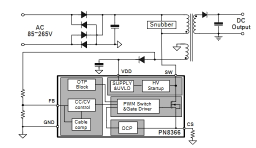 PN8366為原邊反饋工作模式,可省略光耦和TL431。內(nèi)置高壓?jiǎn)?dòng)電路,可實(shí)現(xiàn)芯片空載損耗(230VAC)小于30mW。在恒壓模式,采用準(zhǔn)諧振與多模式技術(shù)提高效率并消除音頻噪聲,使得系統(tǒng)滿足6級(jí)能效標(biāo)準(zhǔn),可調(diào)輸出線補(bǔ)償功能能使系統(tǒng)獲得較好的負(fù)載調(diào)整率;在恒流模式,輸出電流和功率可通過(guò)CS腳的電阻進(jìn)行調(diào)節(jié)。該芯片提供了極為全面的智能保護(hù)功能,包含逐周期過(guò)流保護(hù)、過(guò)壓保護(hù)、開(kāi)環(huán)保護(hù)、過(guò)溫保護(hù)、輸出短路保護(hù)和CS開(kāi)/短路保護(hù)等。