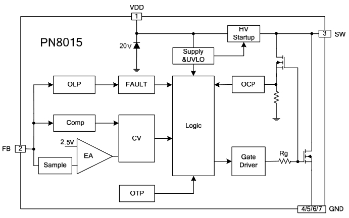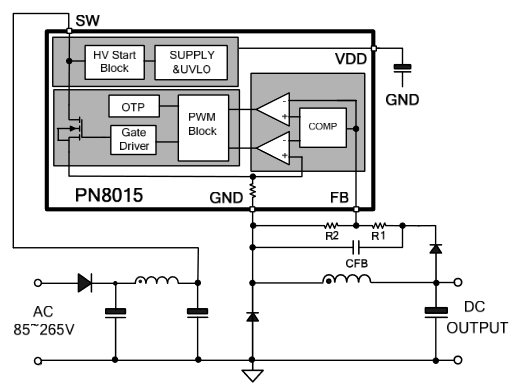 寬輸出范圍非隔離開(kāi)關(guān)電源芯片—PN8015;產(chǎn)品特征:內(nèi)置800V高雪崩能力智能功率MOSFET、高壓?jiǎn)?dòng)和自供電電路、適用于Buck、Buck-Boost、Flyback等多種架構(gòu)、輸出電壓3。3V-12V可通過(guò)FB電阻調(diào)整、半封閉式穩(wěn)態(tài)輸出電流>200mA@230VAC、改善EMI的降頻調(diào)制技術(shù)、優(yōu)異的負(fù)載高速率和工作效率、全面的保護(hù)功能。開(kāi)關(guān)電源芯片—PN8015應(yīng)用于:非隔離輔助電源、家電、智能家居等領(lǐng)域。