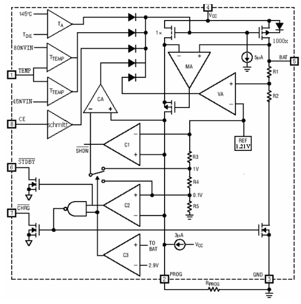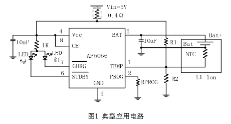 充電電壓被固定在4.2V,充電電流可通過(guò)外部電阻設(shè)置。當(dāng)充電電流在達(dá)到最終浮充電壓之后降至設(shè)定值 1/10 時(shí),AP5056 將自動(dòng)終止充電循環(huán)。當(dāng)輸入端(適配器或USB電源)拔掉后,AP5056自動(dòng)進(jìn)入低電流狀態(tài),電池漏電流將降到2μA以下。AP5056還可被設(shè)置于停機(jī)狀態(tài),使電源電流降到50μA。其余特性包括:電池溫度監(jiān)測(cè),欠壓鎖閉,自動(dòng)再充電和兩個(gè)狀態(tài)引腳以顯示充電和充電終止。