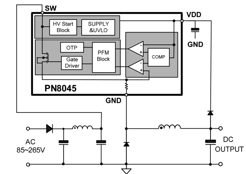 PN8045集成PFM控制器及650V高雪崩能力智能功率MOSFET,用于外圍元器件較簡的小功率非隔離開關(guān)電源。PN8045內(nèi)置啟動模塊,實現(xiàn)系統(tǒng)啟動、待機功能。該芯片提供了智能化保護功能,包括過載保護,欠壓保護,過溫保護。另外PN8045的降頻調(diào)制技術(shù)有助于EMI特性。