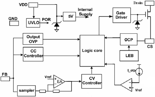PL3325C 同時具有多種保護功能:逐周期峰值電流檢測、欠壓保護、過壓保護等。內(nèi)部框架圖如下所示