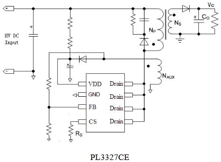 PL3327CE 是一系列高效率、高集成度、原邊調(diào)節(jié)的 PWM功率開關(guān),其主要應(yīng)用于小于 18W 的 AC/DC 反激式開關(guān)電源。PL3327C 通過去除光耦以及次級控制電路,簡化了充電器/適配器等傳統(tǒng)的恒流/恒壓的設(shè)計(jì),從而實(shí)現(xiàn)高精度的電壓和電流調(diào)節(jié),復(fù)合模式的應(yīng)用使得芯片能夠?qū)崿F(xiàn)低靜態(tài)功耗、低音頻噪音、高效率。而且高集成的功率 MOSFET 能夠降低外部 PCB的面積以及系統(tǒng)的成本。PL3327C 同時(shí)具有多種保護(hù)功能:逐周期峰值電流檢測、欠壓保護(hù)、過壓保護(hù)等。