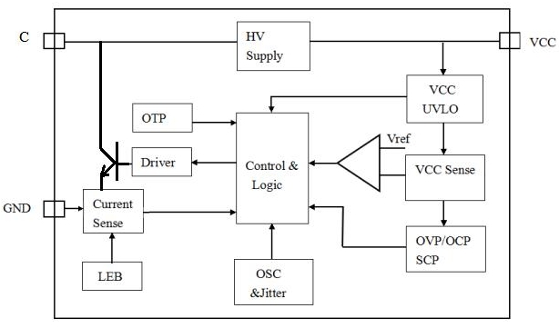 其內部集成了高壓功率開關,采用專利電壓電流控制技術,無需外部電壓反饋和電流偵測電路即可實現(xiàn)精確的電壓和電流調節(jié),極大的方便客戶使用。