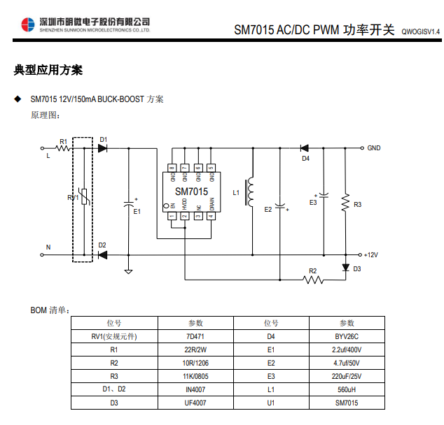 SM7015 是采用電流模式 PWM 控制方式的功率開關(guān)芯片,集成高壓啟動電路和高壓功率管,為低成本開關(guān)電源系統(tǒng)提供高性價比的解決方案。芯片應(yīng)用于 BUCK 系統(tǒng)方案,支持 12V/18V 輸出電壓,很方便的應(yīng)用于小家電產(chǎn)品領(lǐng)域。并提供了過溫、過流、過壓、欠壓等完善的保護功能,保證了系統(tǒng)的可靠性。
