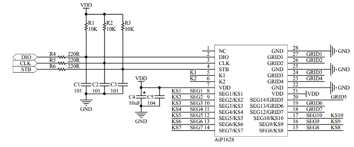 AiP1628是帶鍵盤掃描接口的LED驅(qū)動控制專用電路,內(nèi)部集成有MCU數(shù)字接口、數(shù)據(jù)鎖存器、鍵盤掃描等電路。本產(chǎn)品主要應(yīng)用于VCR、VCD、DVD及家庭影院等產(chǎn)品的顯示屏驅(qū)動。