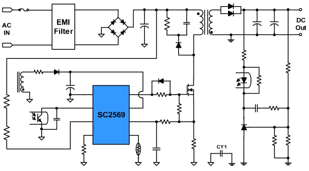SC2569 是高度集成的電流模式 PWM 電源控制芯片。SC2569 空載時(shí)工作在間歇模式降