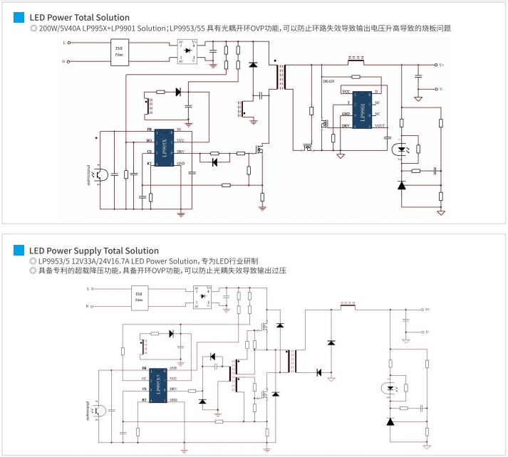 對于100~200W的LED照明系統(tǒng),推薦使用LP9952/53或LP9955/56作為PWM控制器,以及LP9901/LP9911作為SR控制器。這種配置提供了開環(huán)限壓功能,確保了高可靠性和低成本。推薦的電壓配置為5V40A,足以滿足中等功率LED燈具的需求。